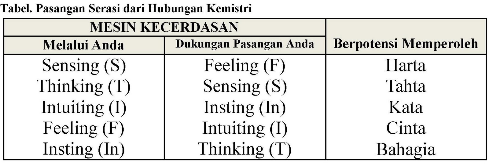 Dalam teori kecerdasan tunggal, Carl Gustaav Jung dengan jelas menyatakan bahwa satu orang hanya memiliki satu kemistri bawaan yang sejalan dengan jenis kecedasan tunggalnya. Kemistri (eng=cham), dalam istilah serapan dari buku DNA SUKSES-MULIA merupakan garis tangan dari mesin kecerdasan seseorang bila dimasukkan unsur alam semesta dari ilmu daratan china (teori U-sing) seperti tabel berikut.